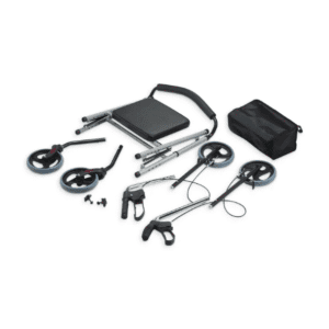 Freios na manopla, ativos em movimento ou travado quando sentado;