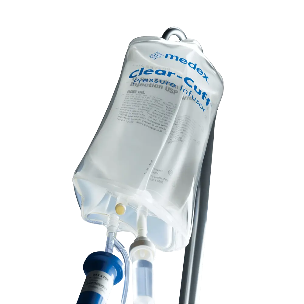 Bolsa pressórica transparente que facilita a visualização do nível de fluido, garantindo preparo e substituição rápidos. Possui fluxo consistente para um gerenciamento eficiente, insuflação ágil e desinsuflação quase imediata graças à válvula HI-FLO™. Conta com gancho integrado que permite a troca da bolsa sem remover do suporte de soro. Reutilizável e fácil de higienizar.