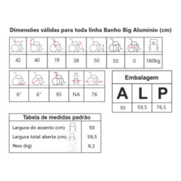 A Cadeira de Banho Big Alumínio suporta até 160 kg, oferecendo conforto e segurança. Feita em alumínio, é leve, resistente e ideal para quem precisa de mais suporte durante o banho.