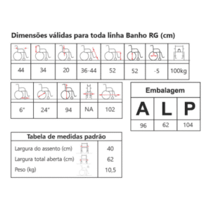 A Cadeira de Banho RG suporta até 100 kg, com estrutura em aço (opcional em alumínio) resistente e design funcional. Proporciona segurança e conforto no banho, ideal para uso diário.