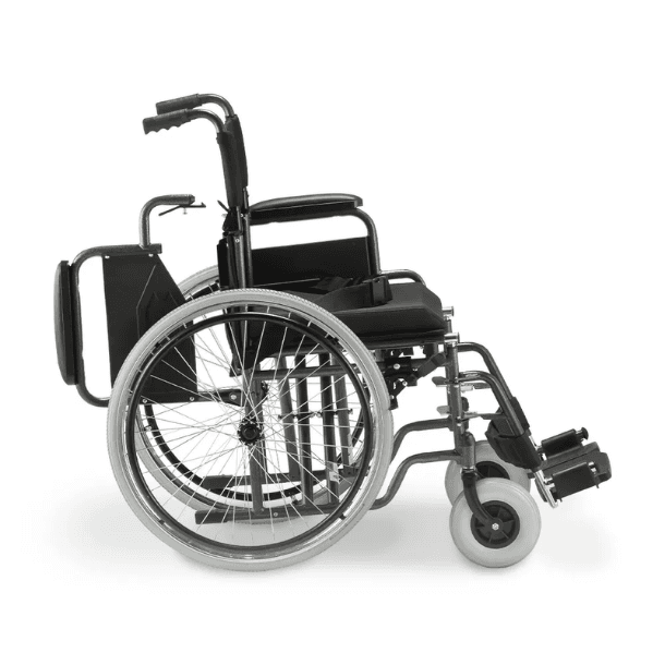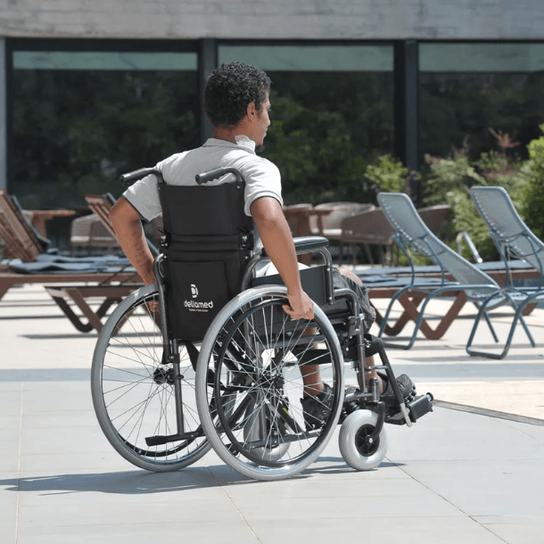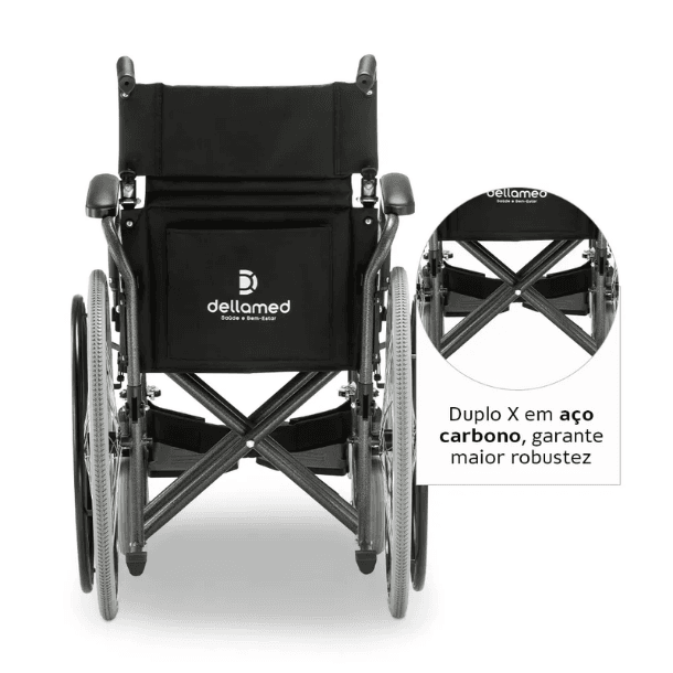 A Cadeira de Rodas D400 Dellamed foi projetada para atender às necessidades de de adultos e idosos com limitações de mobilidade. Seu chassi tubular de aço carbono, com pintura epóxi, garante durabilidade e estabilidade, suportando até 120kg, tornando-a uma opção confiável e resistente para uso diário.