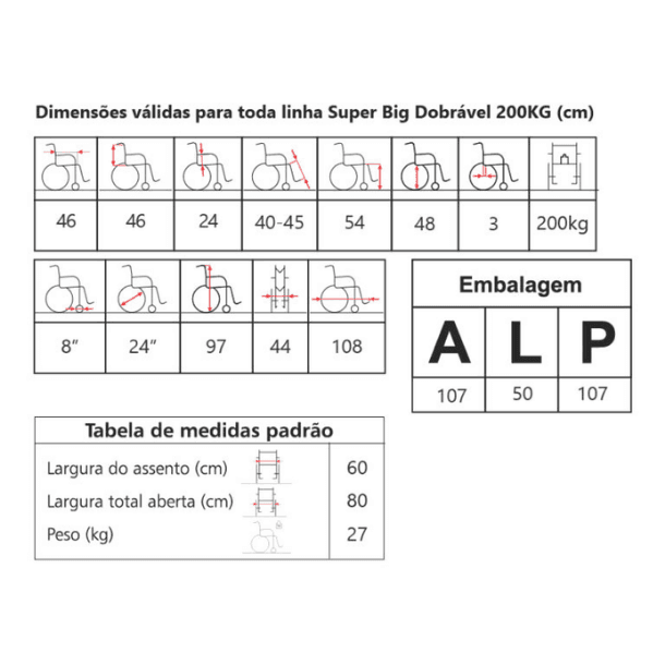 A Cadeira de Rodas Super Big Dobrável suporta até 200 kg, proporcionando robustez e resistência para o uso diário. Sua estrutura reforçada e design dobrável oferecem praticidade e facilidade de transporte.