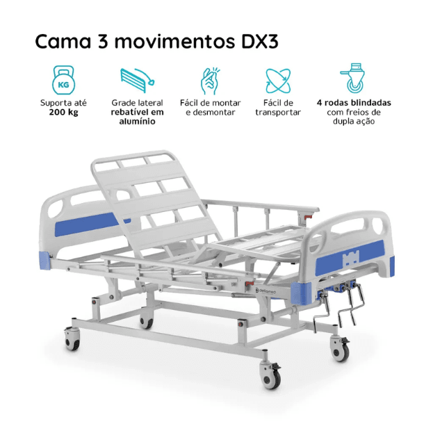A Cama Hospitalar DX3 Movimentos Dellamed oferece conforto e segurança para usuários acamados, especialmente idosos. Além disso, suporta até 200 kg, o que garante robustez e estabilidade durante o uso.