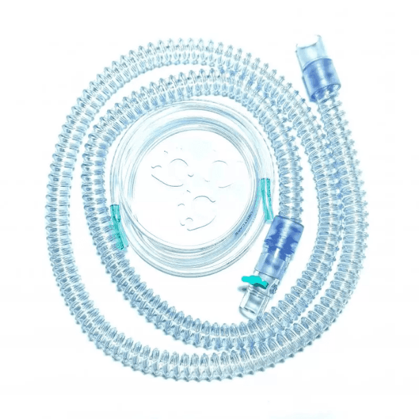 Kit montado com traqueia espiralada em PVC atóxico. O Sistema Hospitalar BPAP, pode ser usado para fornecer suporte de pressão para pacientes adultos apropriados com falha respiratória ou Apneia Obstrutiva do sono (OSA). Pode ser administrado rapidamente – sem entubação – em pacientes selecionados que possam apresentar: Hipoventilação Alveolar – Hipoxemia e /ou Hipercapnéia persistente fadiga Muscular ventilatória. Configuração do Circuito: 1x Traqueias 22 x 1800 mm; 1x Válvula SIMPLE PORT (Válvula Exalatória); 3x Clipes para fixação da linha Proximal à traqueia; 1x Linha Proximal (Tubo adicional de O²)