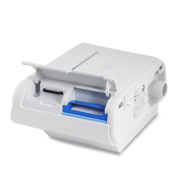 Este CPAP possui uma ótima tela colorida para navegação entre os menus. As configurações são ajustadas girando e apertando o botão rotativo, muito simples e intuitivo. Um sensor de luz na parte superior da máquina ajusta automaticamente a intensidade do brilho na tela, de acordo com os níveis de iluminação do ambiente e se apagando por completo quando estiver escuro e não estiver sendo manuseado.