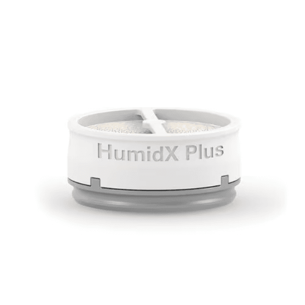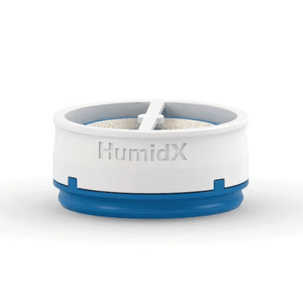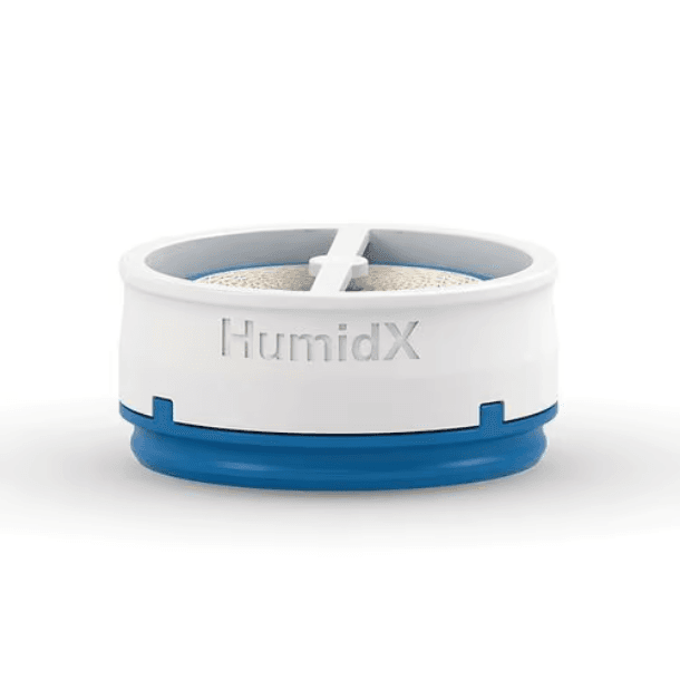 O HumidX é uma espécie de capsula que fica armazenada na conexão da tubulação. Esse acessório contém partículas que capturam o calor e umidade expelidos na exalação do ar, armazenam e liberam na inalação com o ar umidificado e aquecido juntamente ao fluxo de ar pressurizado pelo CPAP.