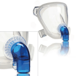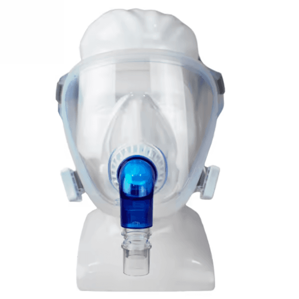 A FitLife SE (sem exalação) canaliza o fluxo de ar de modo não invasivo para um paciente com ou sem oxigênio suplementar, pois possui entrada para oxigênio a partir do cotovelo na cor azul, que identifica a máscara como não ventilada (sem porta de exalação).
