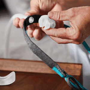 O sistema de encaixe da almofada na estrutura da máscara Pillow 3100 também possui ímãs com intensidade de campo 0,2 mT a 5 cm do dispositivo. O que torna a montagem e desmontagem, uma tarefa muito simples. Pois apenas com a aproximação da almofada na estrutura, já encaixa para iniciar a terapia.