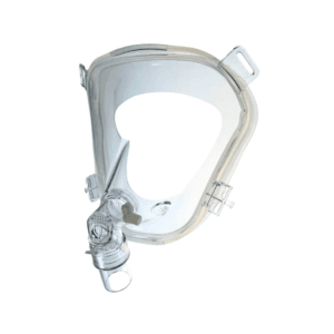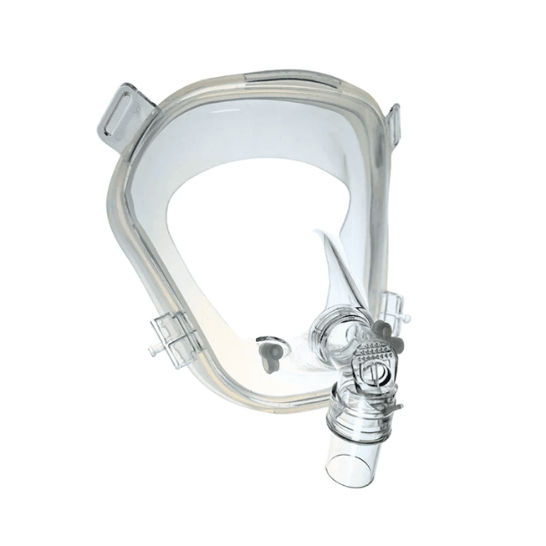 Máscara total face tamanho único, para pacientes adultos. Dispositivo fabricado em silicone, com cotovelo, clipe, armação e adaptador em PVC. Produto reutilizável, livre de látex, com conector OD: 22mm e cotovelo com exalação. Utilizado como acessório para de CPAP, BIPAP e ventiladores pulmonares.