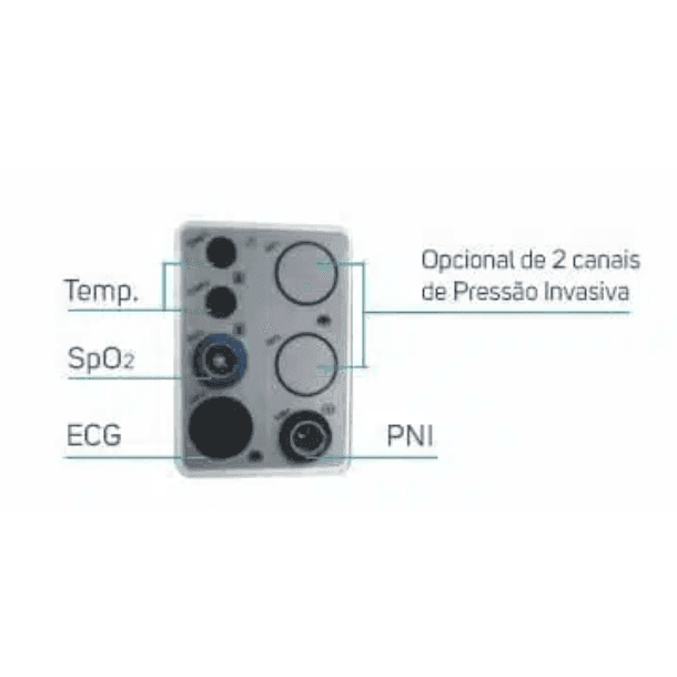 O monitor atende tanto pacientes adultos quanto pediátricos. Ele monitora os principais parâmetros: eletrocardiograma (ECG), respiração (RESP), saturação de oxigênio no sangue (SpO2), pressão arterial não invasiva (PNI) e temperatura (TEMP) em 2 canais.