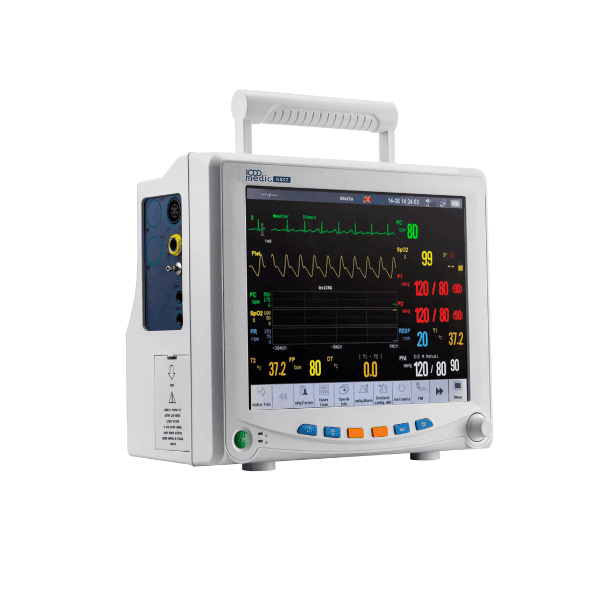 O monitor acompanha sinais vitais críticos com precisão, incluindo ECG, SpO2, respiração, temperatura, pressão arterial invasiva e não invasiva, além de capnografia.