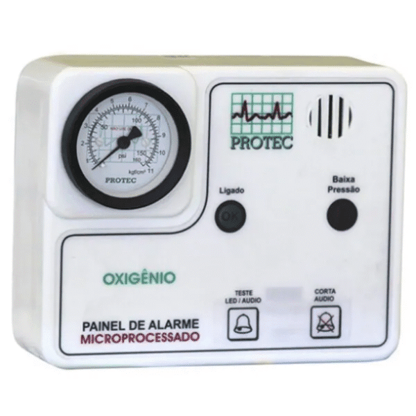 O Painel de Alarme O₂ da Protec é projetado para garantir a segurança e eficiência em ambientes hospitalares e clínicos que utilizam oxigênio medicinal. Com tecnologia microprocessada e pressostato calibrado, este painel monitora continuamente a pressão da rede de oxigênio, acionando alarmes audiovisuais em caso de queda abaixo dos níveis estabelecidos. ✅ Características Principais Monitoramento contínuo da pressão da rede de oxigênio Alarme sonoro tipo bip e sinalização visual por LED Pressão de acionamento: 3,5 kgf/cm² Caixa em material termoplástico de alta resistência Identificação clara do tipo de gás através de etiqueta frontal Sistema microprocessado para detecção de variações mínimas de pressão Conformidade com normas ABNT Funcionamento dependente de sistema elétrico