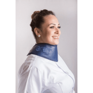O design anatômico cobre totalmente a região da tireoide, enquanto o fecho em velcro na parte posterior permite um ajuste rápido, seguro e confortável ao pescoço do paciente.